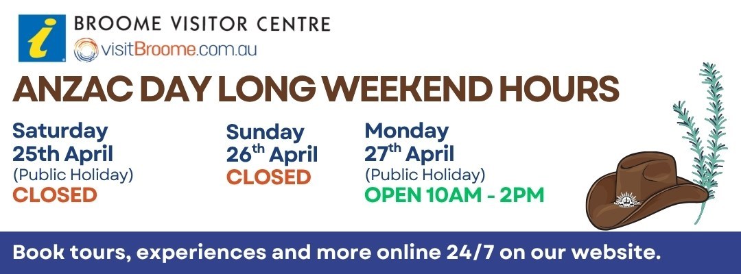 Broome holiday? Broome tour? Broome trip? Book locally with the Broome Visitor Centre.
