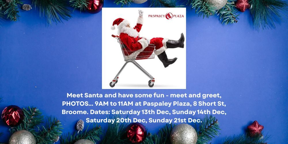Meet Santa and have some fun - meet and greet, PHOTOS... 9AM to 11AM at Paspaley Plaza, 8 Short St, Broome. Dates: Saturday 20th Dec, Sunday 21st Dec.