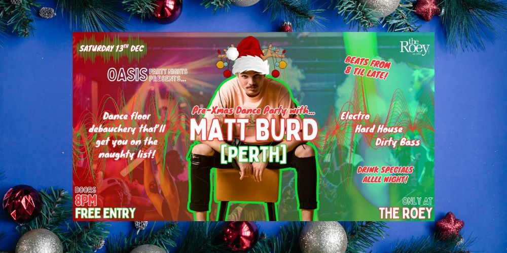 Saturday 13th December. EDM Anthems, Hard House & Dirty Bass from 8 til late, with one of your faves MATT BURD behind the decks. FREE ENTRY until 9pm, Drink Specials all night! Doors Open 8pm. Entry $10 after 9pm.