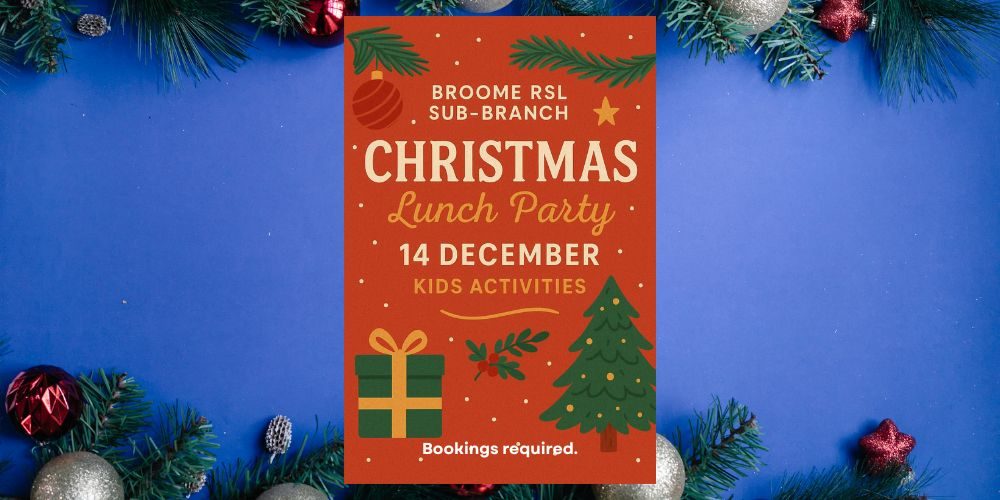 This year, the Broome RSL brings you the most festive and beautifully decorated venue in Broome, don’t miss it! Sunday 14 December– from 12:30pm. The Broome RSL Sub-Branch invites you to celebrate Christmas with us this Sunday 14 December from 12:30pm! Entry: $15 for non-members (finger food buffet included). Bookings required for children (all ages, little and big!).