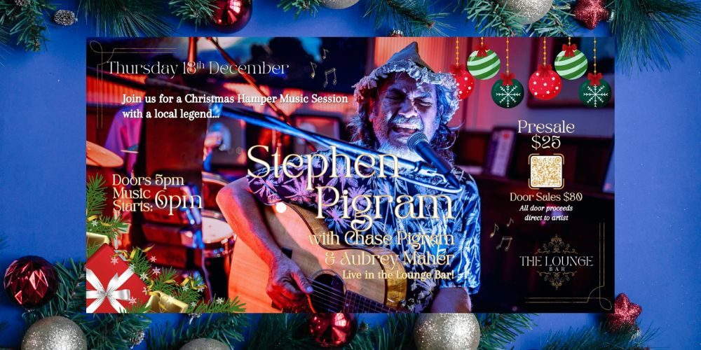 A very special Thursday evening of live music in The Lounge with this legendary local musician... STEPHEN PIGRAM with Chase Pigram & Aubrey Maher, with a Christmas Hamper Music Session. Thursday 18th December. Presale Tickets $25 / Door sales on the night $30 (if capacity allows). Doors open 5pm / Music starts 6pm.