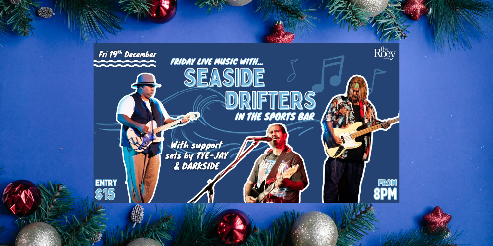 Don't miss a very special pre Xmas instalment of Live Music Friday with SEASIDE DRIFTERS in the Sports Bar! Friday 19th December. Supported by the smooth soul & blues sounds of Tye-Jay, plus a touch of rock with Darkside. Entry $15, via Oasis doors from 8pm.