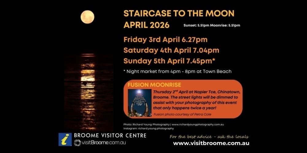 Thursday 2nd April 2026 - Experience one of Broome’s most magical natural events at the Fusion Moonrise. As the full moon rises over Napier Terrace, it aligns perfectly with the iconic Fusion sculpture located at the Carnarvon Street roundabout in Chinatown — creating a breathtaking visual that draws photographers, locals and visitors alike. Free to attend - no bookings needed. Attendees are encouraged to arrive early to secure a good viewing spot and to walk, cycle or use public transport where possible, as traffic restrictions will apply in the area. Join us for this special evening where the moon, art and community align in one unforgettable moment. Visibility may vary depending on the local weather, tides, sunset and moonrise.