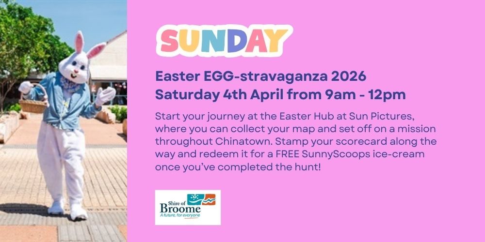Easter in Broome is always lots of fun. We are pretty egg-static about the public holidays too. There are always plenty of fun activities and events to enjoy for visitors to Broome over Easter and the WA school holidays (Fri 3 April 2026 - Sun 19 April 2026).