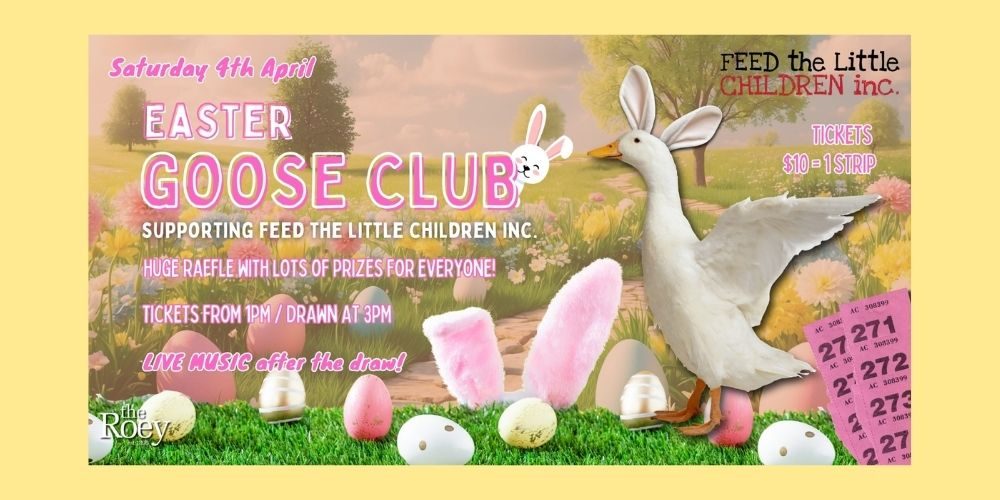 The annual Easter draw! Be in the Sports Bar on Saturday 4th April for 2026 EASTER GOOSE CLUB raising money for FEED THE LITTLE CHILDREN INC. There'll be LOADS of incredible prizes up for grabs, drink specials all arvo, free pizza, live footy, sports girls PLUS live music straight after the draw! Mark the date down in your calendars & let the social squad know you've got epic prizes to win.