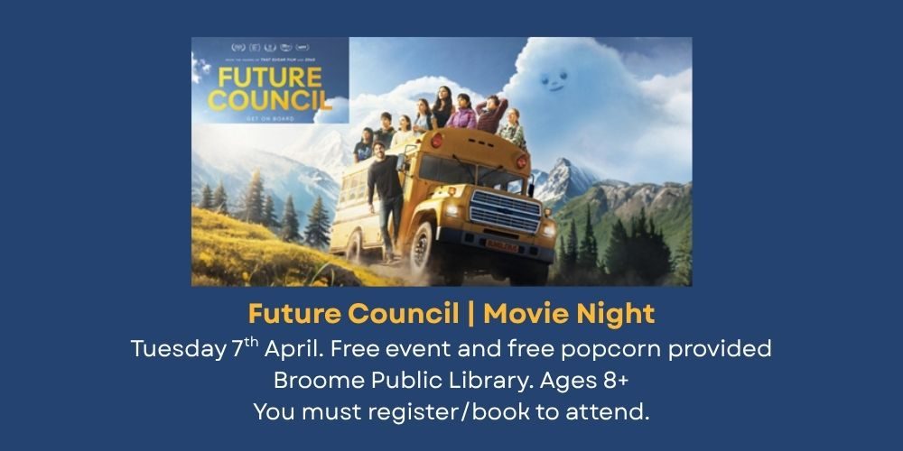 The Shire of Broome are holding a free movie event on Tuesday 7th April 4.30pm at the Broome Public Library. Free popcorn provided. Ages 8+. You must register/book to attend. Details