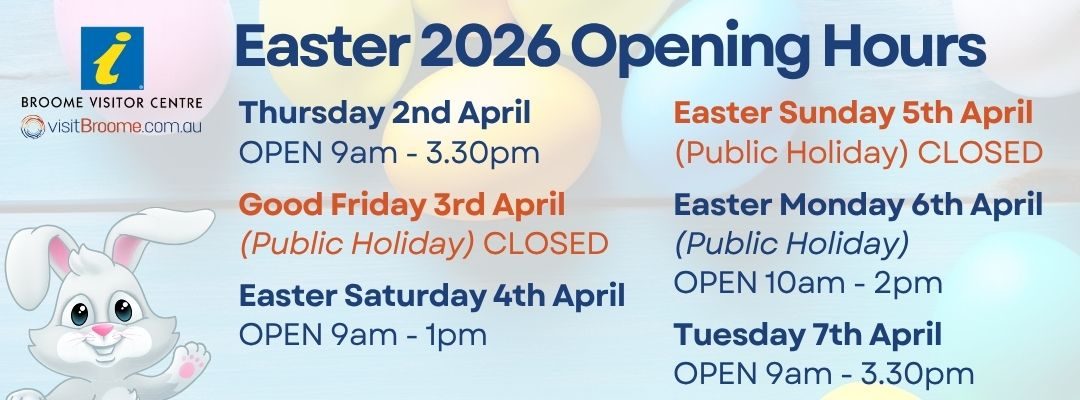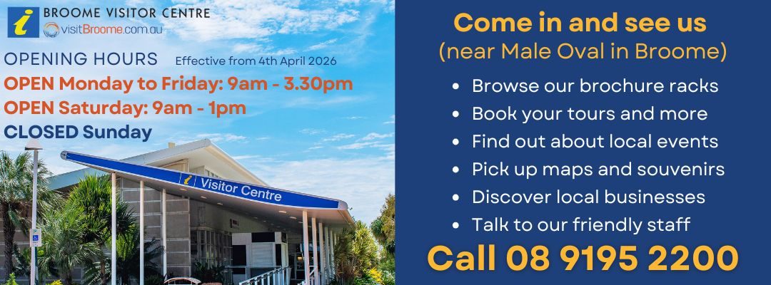 Please see the current opening hours for the Broome Visitor CentreOPEN Monday - Friday, 9am to 3.30pm.