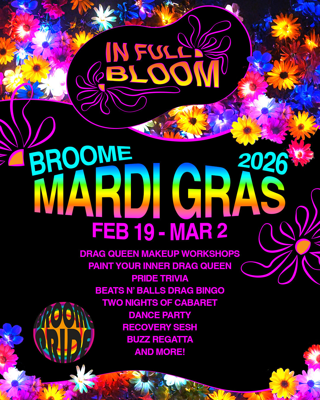 IN FULL BLOOM — BROOME MARDI GRAS 2026! The glitter’s already calling. Broome Pride Inc are thrilled to announce the dates for Broome Mardi Gras. 19th February to 2nd March 2026.