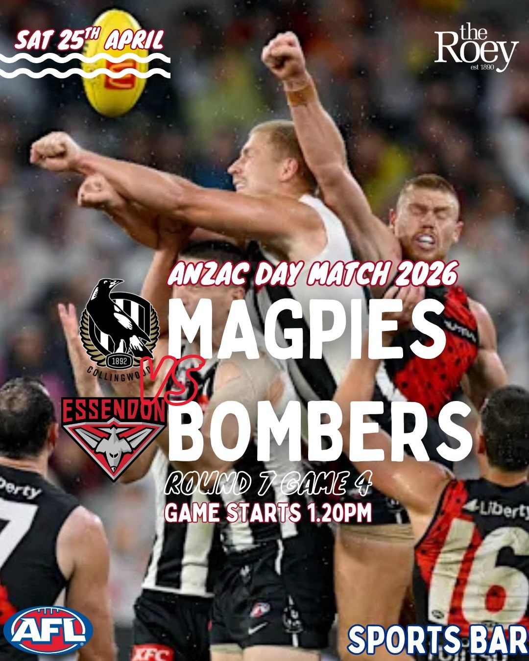 AFL ANZAC Game from 1.20pm at The Roey Sports Bar.