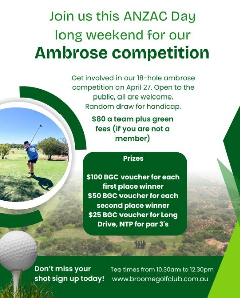 Name a better way to finish a long weekend! Join the Broome Golf Club this ANZAC Day long weekend for a special ambrose competition on Monday, April 27. All are welcome to enter, you don't need to be a member or have a handicap. To enter visit broomegolfclub.com.au or have a chat to our Golf Shop staff and they will sort you out. Call 9192 2092; visit the Golf Shop (7am - 5pm) or email [email protected].