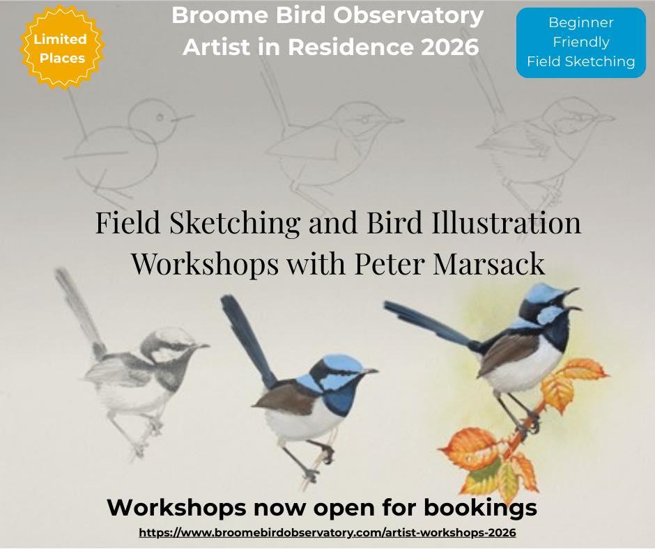 Join award-winning bird illustrator Peter Marsack at Broome Bird Observatory for a series of small-group workshops during his 2026 Artist in Residence. Field Sketching All Levels - 3 hr Workshop. Sunday 14th June Times: Morning sessions: 8:30am. Afternoon sessions: 2:00pm.