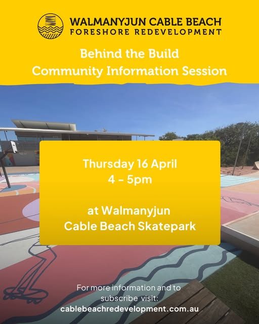 Curious about what’s happening at Walmanyjun Cable Beach? Join the Shire of Broome at 4pm on Thursday 16th April for Behind the Build, a community drop-in information session at the Skatepark where you can speak directly with Shire staff about the Walmanyjun Cable Beach Foreshore Redevelopment. Chat with the people behind the project about construction updates and how you can stay informed as work progresses.