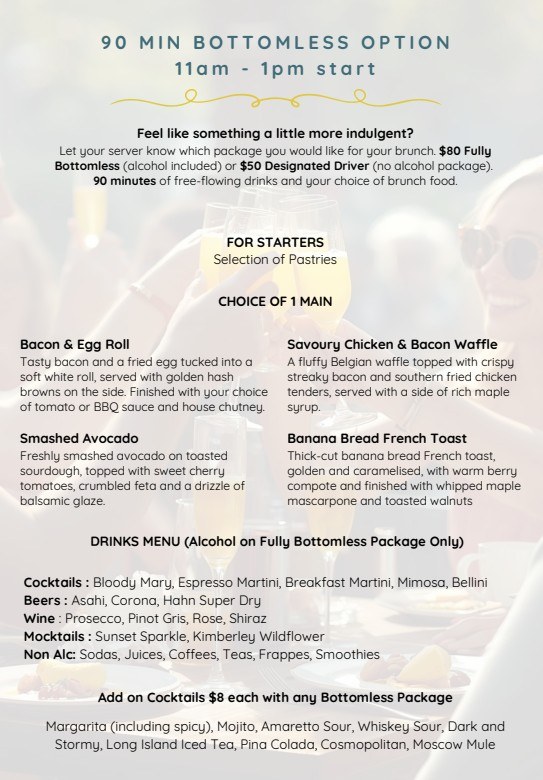 Picture this: endless laughter, clinking glasses, and the aroma of freshly brewed coffee mingling with tasty brunch delights. At The Broome Closet, we're not just offering brunch; we're crafting an unforgettable journey for your senses. Join The Broome Closet for brunch every Saturday between 11am and 1pm and choose from our selection of tasty brunch dishes along with a great selection of drinks both alcoholic and non-alcoholic. Looking for something a little more indulgent? Try our 90min Fully Bottomless option ($80pp), where the libations flow freely, and the possibilities are endless. or our Designated Driver option ($50pp) features a selection of mocktails that promise to tantalise your taste buds.