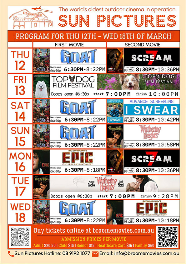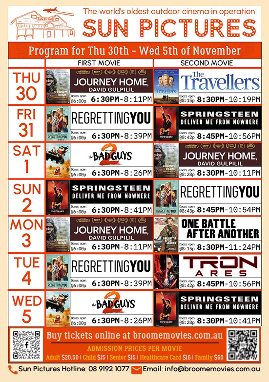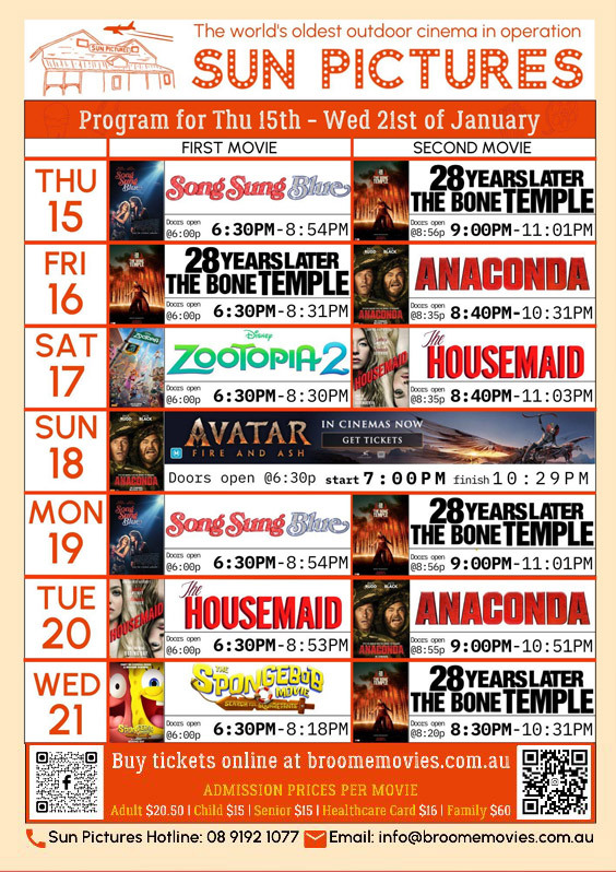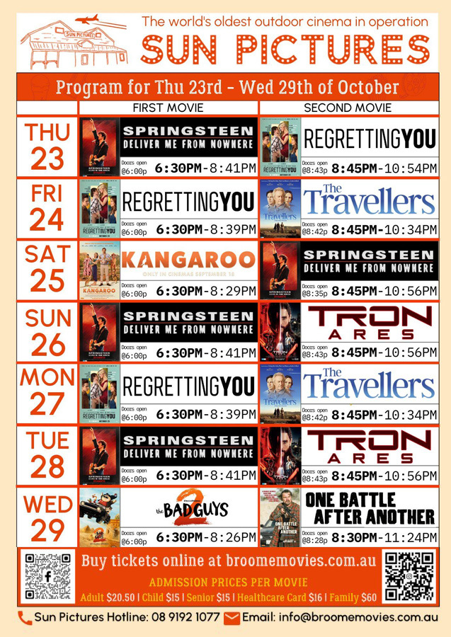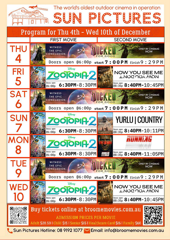 Catch at movie at Sun Picture Gardens. Two movies nightly. Upcoming session times are below. Book tickets online at www.broomemovies.com.au or arrive early to book at the cinema.