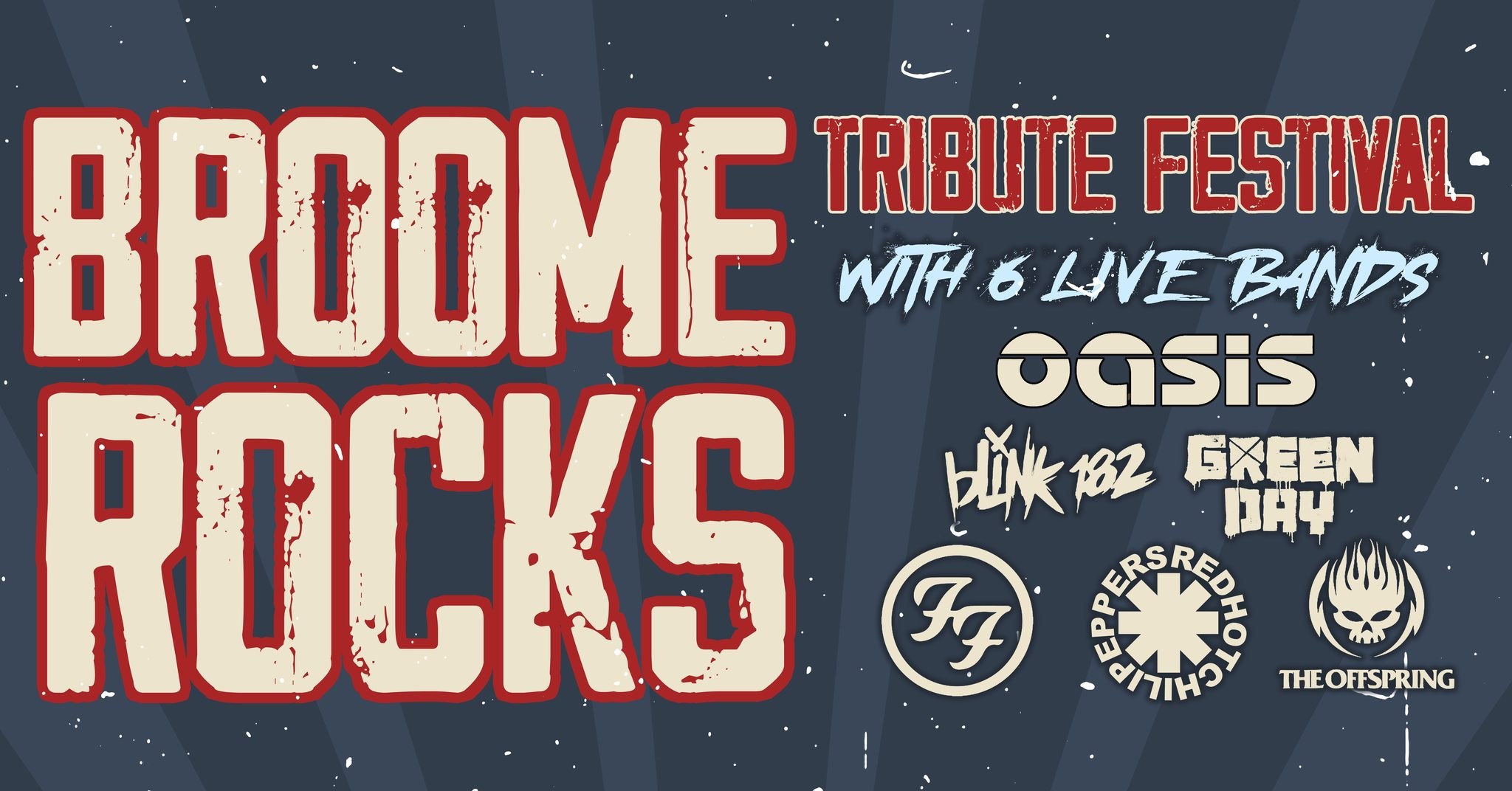 Get ready for BROOME ROCKS! The biggest rock tribute fest around. Saturday 30th May at The Roey. With 6 awesome tribute bands to Oasis | Blink 182 | Green Day | Red Hot Chili Peppers | The Offspring | Foo Fighters. This will be a massive night in the beer garden so grab your tickets asap!. Featuring some of the best Perth based bands touring Australia this May. Proudly Presented by Bosh Events & Grandstand Agency