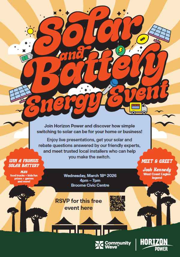 Join Horizon Power at Broome’s most exciting Solar and Battery Energy Event and discover how simple switching to solar can be for your home or business! Whether you’re just starting your solar journey or looking to upgrade with a battery, this free event gives you all the facts, the savings, and the simple steps to help you get started. Plus, catch Josh Kennedy and clean energy experts live, meet your trusted local installers, enjoy tasty food trucks, fun kids’ entertainment and a chance to win a stack of awesome prizes!
