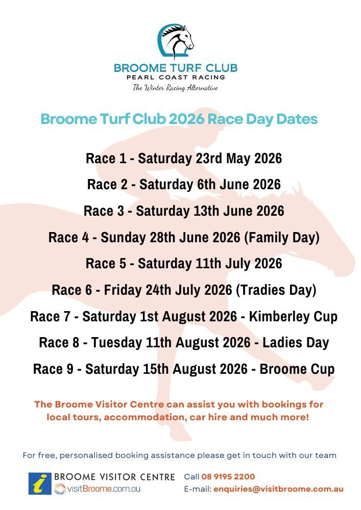 The Broome Visitor Centre can help with your racing season accommodation bookings, car hire, tours information and planning.