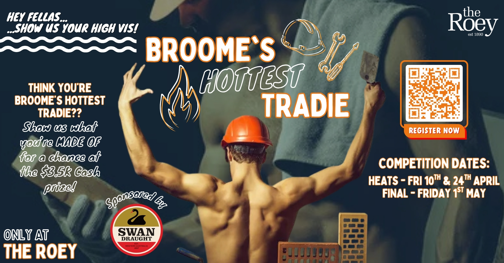 Think you’re one of Broome’s HOTTEST Tradies? Well it’s time to take off that high vis & show us what you’re MADE of fellas! The Roey & Swan Draught present...BROOME'S HOTTEST TRADIE 2026. We’re looking for local tradies who are game enough to strut their stuff for a chance to win the incredible $3,500 CA$H prize, plus the ultimate bragging rights of being the hottest tradie in town. We’re looking for confidence, skills & a bit of cheeky charm…This isn’t just about looks or a bod, you’ll need to bring the banter, tackle some fun challenges & show off what makes you the ultimate HOTTEST tradie. GRAND FINAL: Friday 1st May. The format will consist of showing off your tradie look, showing off your impressive rig & a skills based challenge to make sure you not only know your tools, but you know how to use them.