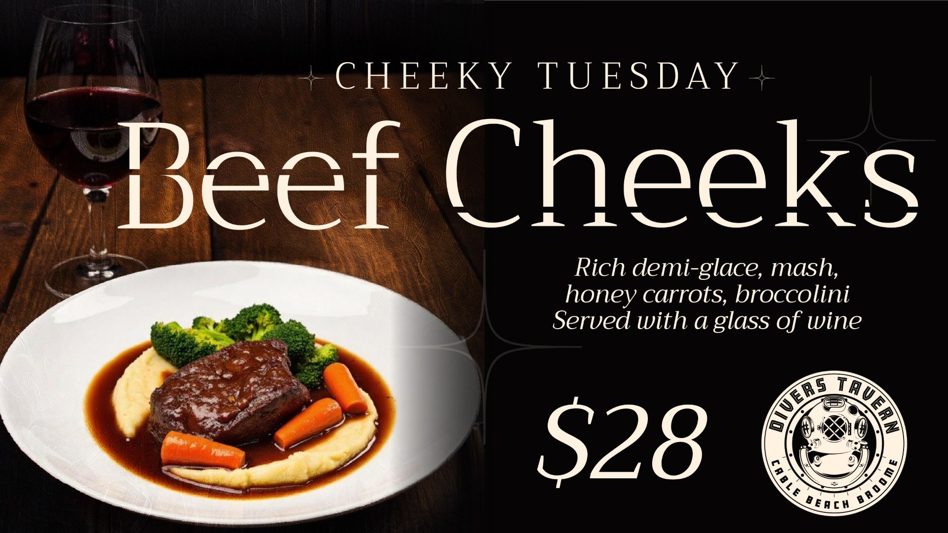 Enjoy cheeky Tuesdays at Divers - book your table between 5pm - 8pm. Slow cooked beef cheeks and a glass of house red! $28