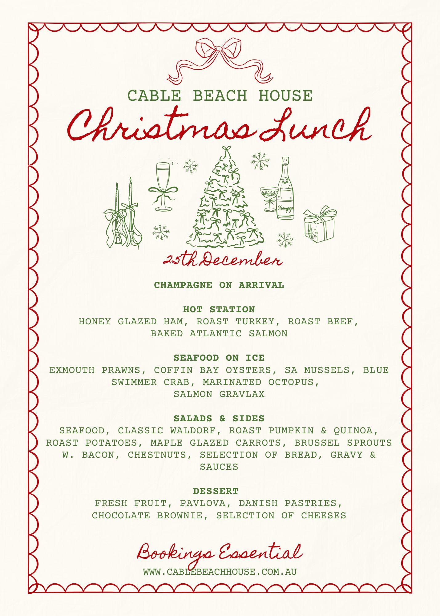 Join Cable Beach House on Christmas Day for a full buffet lunch. Bookings are essential. Venue open: 12pm - 4pm. Buffet served from 12pm - 2:30pm