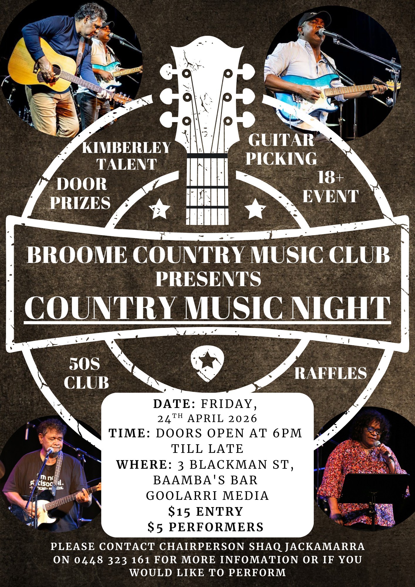 Come join us next month, Friday 24th April for another Country Music Night at Goolarri Media Enterprises, Baamba's Bar. Additional information for performers: no thongs, singlets or board shorts. zero tolerance for performers under the influence. Please get in contact with the Committee or President if you would like to perform. Hope to see you there, please find the details below!