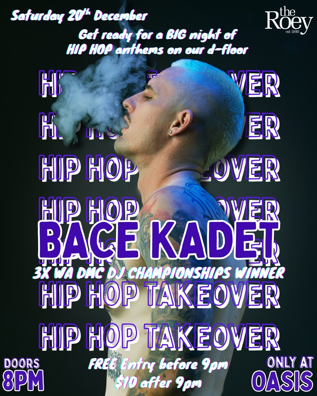 Who's ready for a BIG night of HIP HOP beats?! Strap in for a huge night on our dance floor with 3x DMC DJ Championships Winner BACE KADET taking over our decks this Saturday night! Bace has become an omnipresent icon of Perth city's club circuit, holding residences at WA's largest hip hop superclub spots, as well hosting numerous events at Metro City, most notably the Official UFC 284 afterparty headlined by Alex Volkanovski & Israel Adesanya. He's toured with some of the biggest names in the Hip Hop scene including Australian rapper Shadow, The Hilltop Hoods, Nerve, Chillinit, Huskii, Wombat, Drapht and MANY more... now he's coming right here to Oasis! Beats from 8 till REALLY late. Drink Specials allllll night. FREE ENTRY until 9pm. Doors open 8pm / $10 after 9pm
