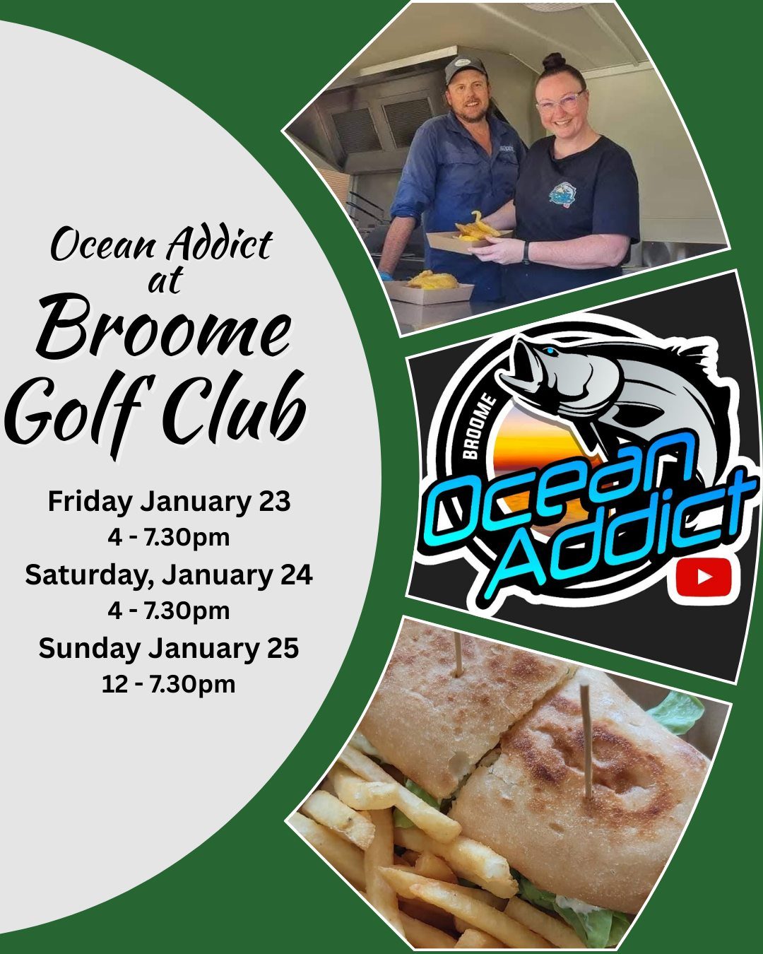 We have two great food options ready and waiting for you at the Broome Golf Club. Enjoy delicious gourmet pizzas from M & J's Pizza Base Monday to Thursday from 5pm to 7.30pm or feast on some amazing fish and chips from Ocean Addict Fish And Chips every weekend from the best spot in town. As well as the bar and the best views in Broome, you really can't go wrong so head on up and enjoy. We'll see you soon!