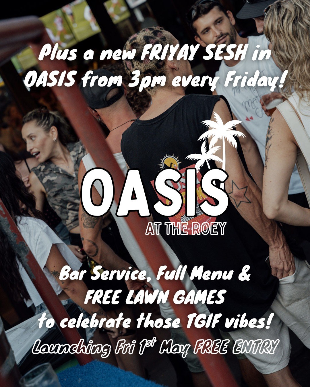 FRIYAY SESH in Oasis at The Roey, this Friday, with full bar service, full menu & FREE LAWN GAMES every week from 3pm... Free Entry.