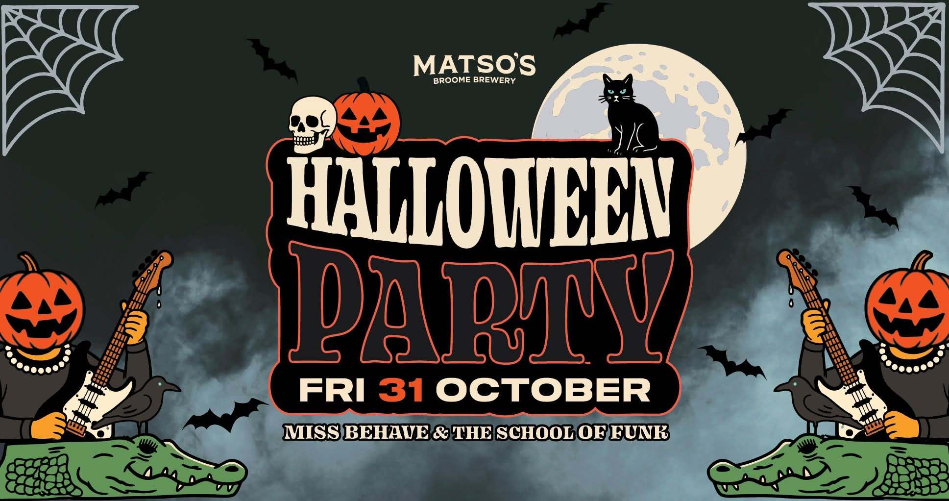 You're Invited to a Haunted Night of Fun! Join Matso's Broome for a Halloween Party full of frights, sights, and live delights! Friday 31st October from 7 PM until the witching hour at Matsos Broome Brewery. 💀 FEATURING: Live Music to wake the dead from MISS BEHAVE & THE SCHOOL OF FUNK from 7:30pm, Spooktacular Drinks & Bites, Costume Contest with Best Dressed Prizes, Costumes are strongly encouraged—the creepier, the better! Bring your boos and let’s raise some spirits!