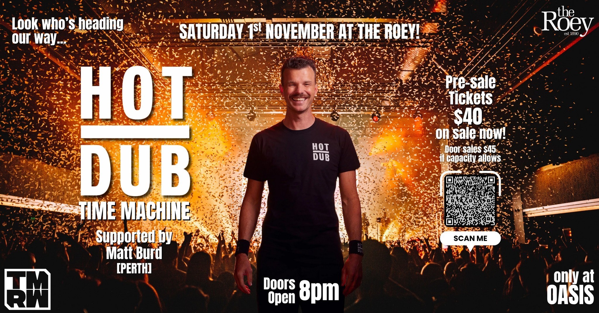 HOT DUB TIME MACHINE. Live at The Roey | Saturday 1st November. Since first launching his time-travelling, ‘dance-through-the-decades’ audio-visual party concept in 2011, Sydney’s Tom Lowndes has grown Hot Dub Time Machine into an absolute monster. This Australian DJ – who showcases songs from every decade and genre of music, weaving it into one expansive, electrifying, music history lesson – has been welcomed by international audiences with open arms.Hot Dub is a main stage regular at festivals all over the world, including Australia’s ‘Splendour in the Grass,’ ‘Falls Festival,’ and ‘Groovin the Moo,’ the UK’s ‘Reading and Leeds,’ ‘Latitude,’ and ‘T in the Park’ (Rip), Europe’s legendary ‘Tomorrowland,’ Benicassim, and EDC Berlin, Asia’s ‘It’s The Ship’ and even, back in 2014, ‘Coachella,’ in the USA. His headline tours move staggering amounts of tickets, with over 12,500 people enjoying two wild solo shows in 2017’s Edinburgh Fringe Festival, two massive shows at London’s legendary ‘Brixton Academy,’ and huge sold-out tours across his Australian home. And now he's coming to Oasis for one night only supported by WA's own MATT BURD