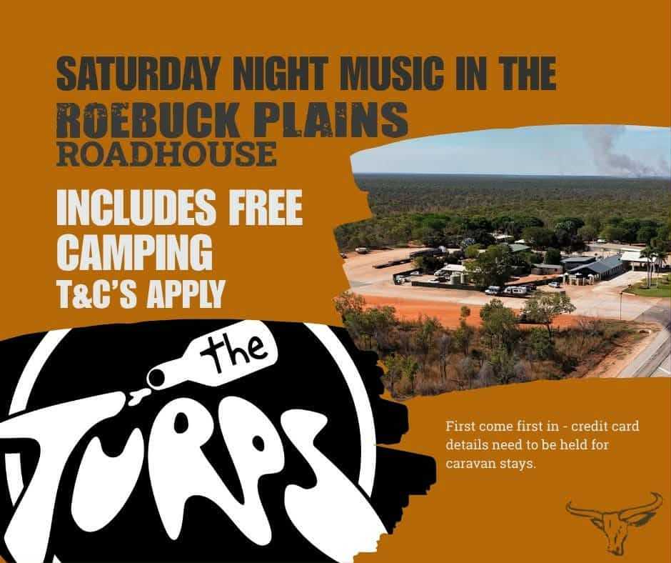 Live Band 'The Turps' & Free Camping on Saturday 18th October at Roebuck Plains Roadhouse. T&C's apply. Free camping in a powered site for 1 night.