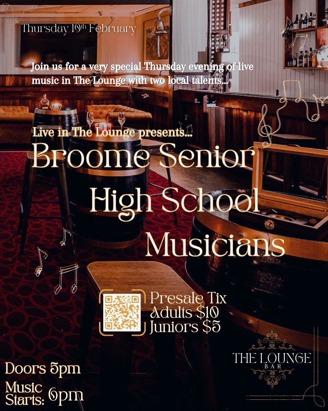 Join us for a very special evening on Thursday 19th February of Live in The Lounge as we welcome some incredible local musicians… BROOME SENIOR HIGH SCHOOL MUSICIANS. Come along & be amazed by the incredible up & coming local talent, while helping them fundraise for their tour to the south west! Cocktail Specials all night & Half Priced Wings until 9pm. Doors open 5pm / Music starts from 6pm. Presale tickets available now for $10 Adults & $5 Juniors, with proceeds from all ticket sales go direct to the artists. Capacity limited to 70 guests, do not miss this very exclusive night of live local music in The Lounge.