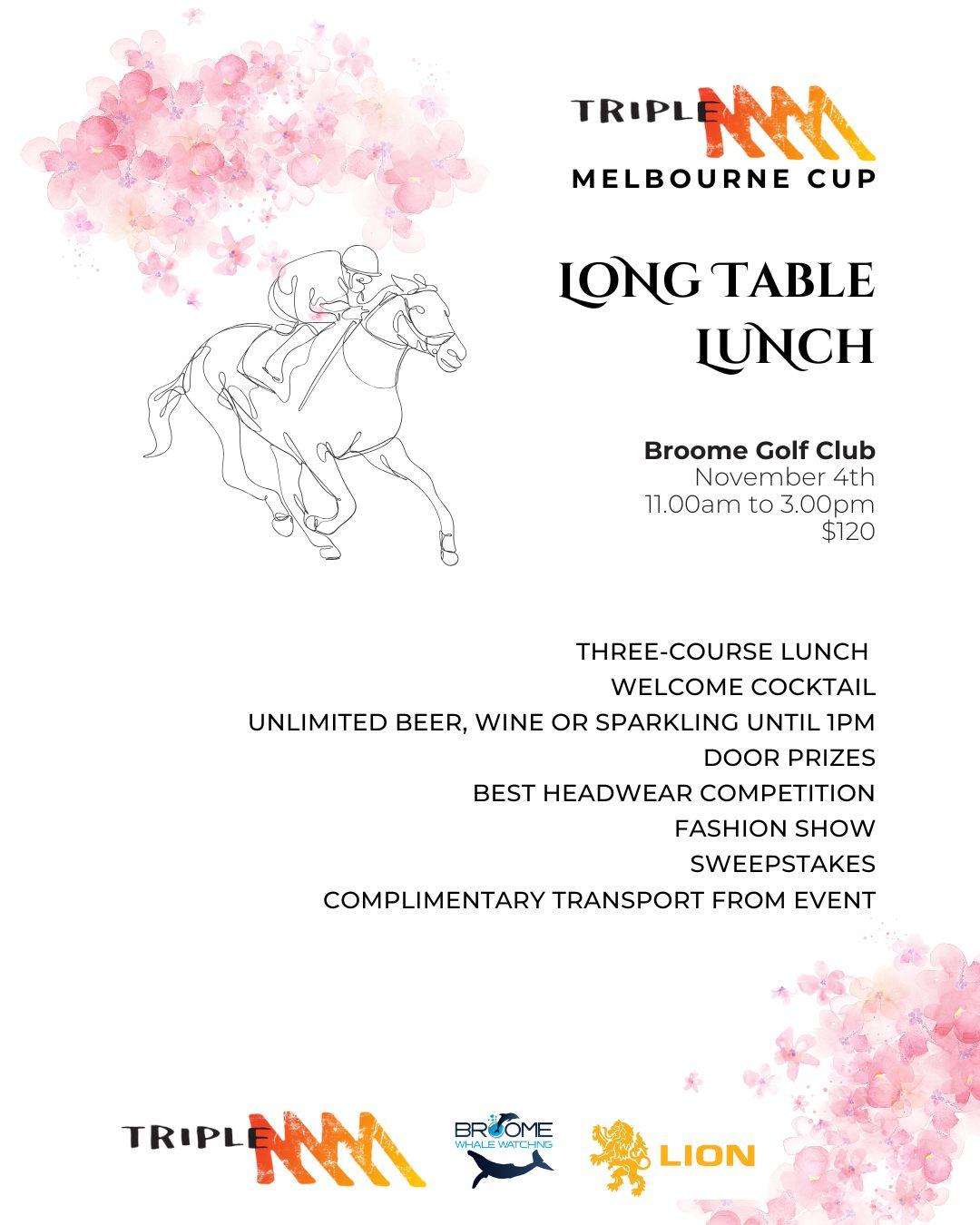 Join us this Melbourne Cup! The Broome Golf Club have teamed up with Triple M Broome to deliver a very exciting Melbourne Cup event, our three-course long table lunch. Get frocked up and watch the race the stops the nation with us and settle in for a fun afternoon with delicious food and drinks. $120 per person.