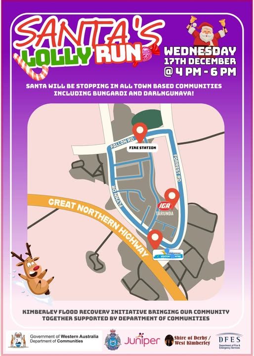 Big news, Fitzroy Crossing! Santa just called to let us know he’ll be making a special stop in town before his grand journey around the globe! When: Wednesday, 17th of December, starting at 4:00 PM. How: Santa will be escorted through the streets by our Local Police! Keep your ears open for sirens and eyes peeled for flashing lights — it’s Santa on the way! Where: Check out the route map below to find out where Santa and his helpers will be spreading some festive cheer! And don’t worry, Santa will also be visiting surrounding communities that afternoon! Come join us for a magical afternoon full of Christmas cheer, treats, and memories! We can't wait to celebrate with you all! This years event is proudly supported by Departments of Communities.