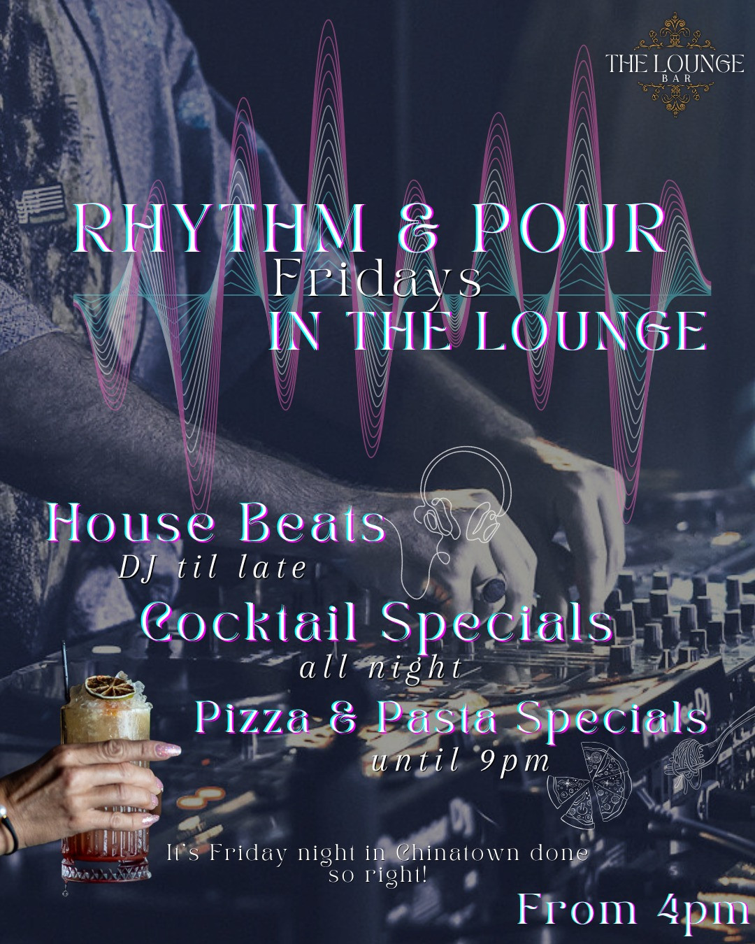 RHYTHM & POUR at The Lounge Bar from 4pm. House beats with Tony from 7pm til late. Cocktail Specials. Doors open 4pm / FREE ENTRY all night.
