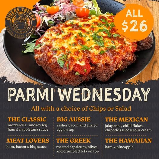 Parmi Night at Divers Tavern from 5pm with your choice of The Classic, Big Aussie, The Mexican, Meat Lovers, The Greek, The Hawaiian, , with chips for $26