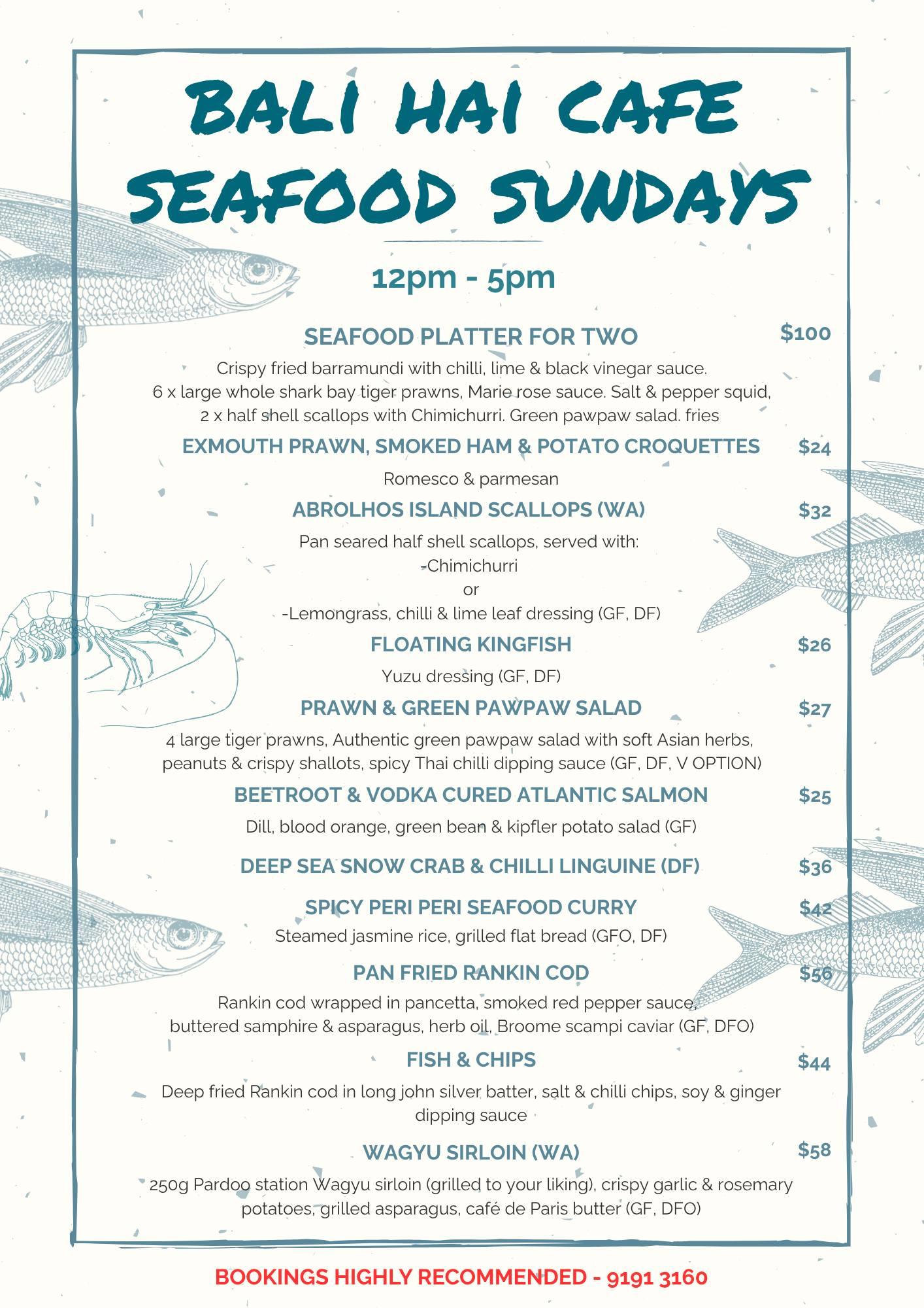 Something different is coming to Sundays at The Bali Hai Cafe. We will be open from 12pm to 5pm serving up our seafood menu below. Book a table on our breezy deck to soak up the beautiful Broome weather or inside our nice cool airconditioned restaurant. Call 089191 3160 or Email [email protected]. You can also book online. Please note we will be closed for dinner service on Sundays.