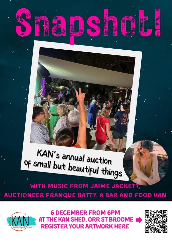 Snapshot is a great night to say thanks and farewell to 2025 from 6pm on Saturday 6th December. We'll have a bar, food, and art as we celebrate the festive season, say thanks to all our KAN Champs and get ready for a Man-gala season break. Artists - you can register a small but delightful work that will be auctioned off in our fun and fabulous annual pre-Xmas auction event. We have Broome's most arty Auctioneer - the inimitable Franque Batty to run the show and the amazing Jaime Jackett Music to play for us ! Event details here