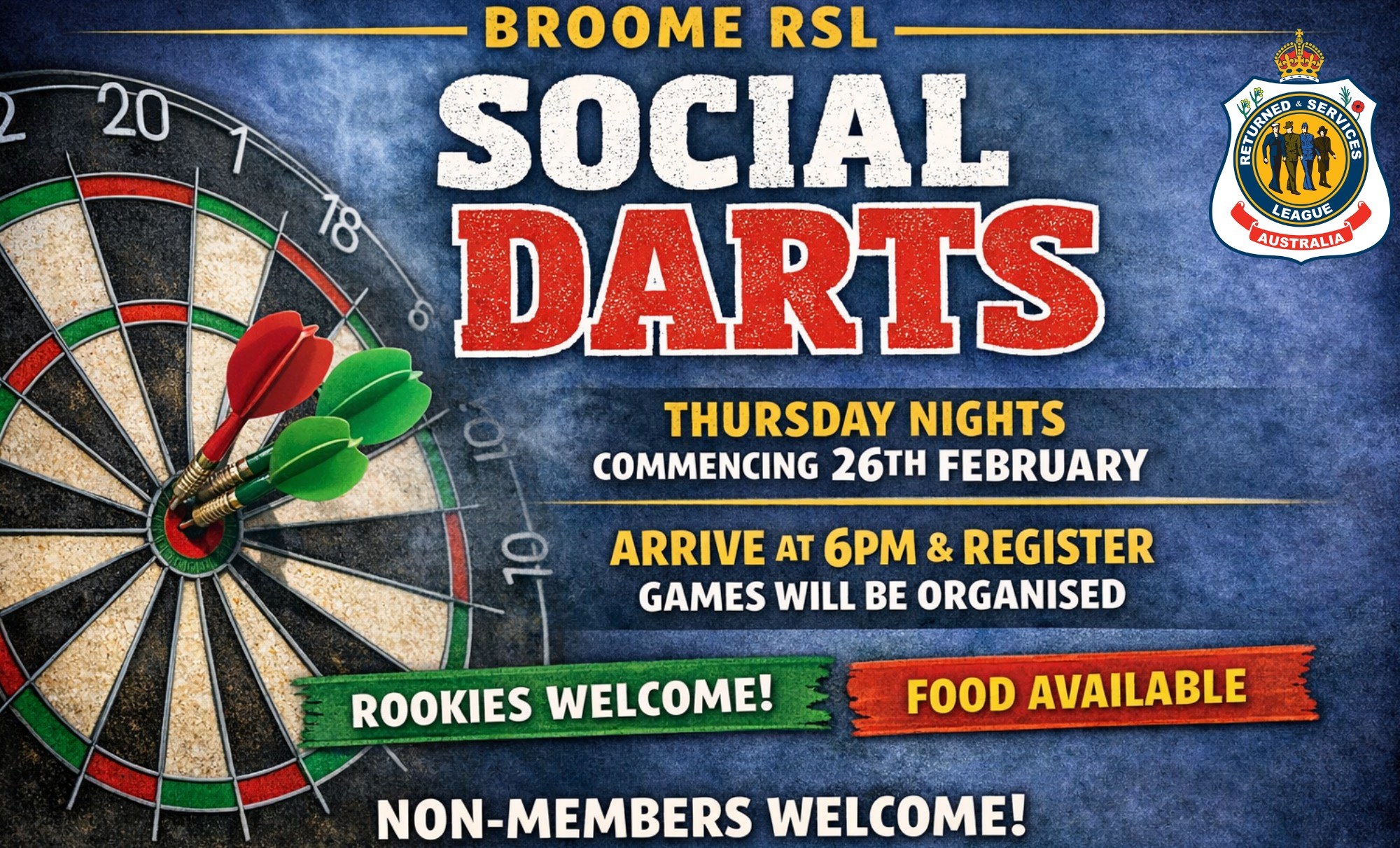 Dust off the old darts, and come down to the Broome RSL for some friendly Social Darts. We also have a few dart sets available to loan on the night. CLUB OPEN: from 3pm on Thursday. DRESS CODE: Smart casual/tidy/no hats under pavilion/sorry but no sleeveless tops guys. COST: To be advised, but no cost for first week on Thursday 26th Feb.