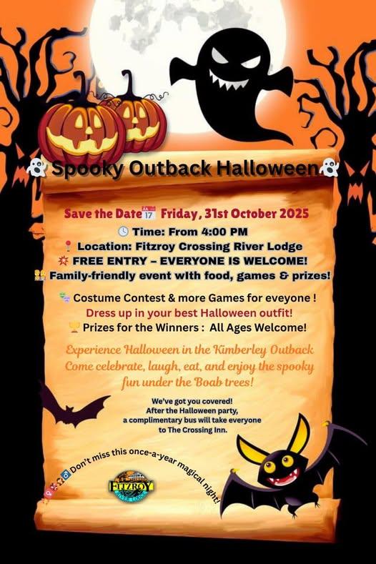Spooky Outback Halloween at Fitzroy River Lodge, Fitzroy River from 4pm on Friday 31st October. Free Entry, Family friendly fun.