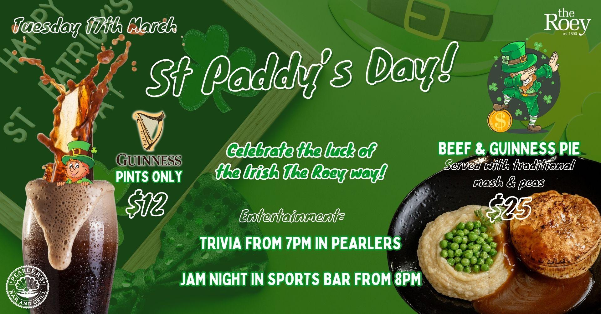 It's almost ST PADDY'S DAY for another year... so here's how you can celebrate the luck of the Irish The Roey way. Beer Special: Pints of GUINNESS...only $12