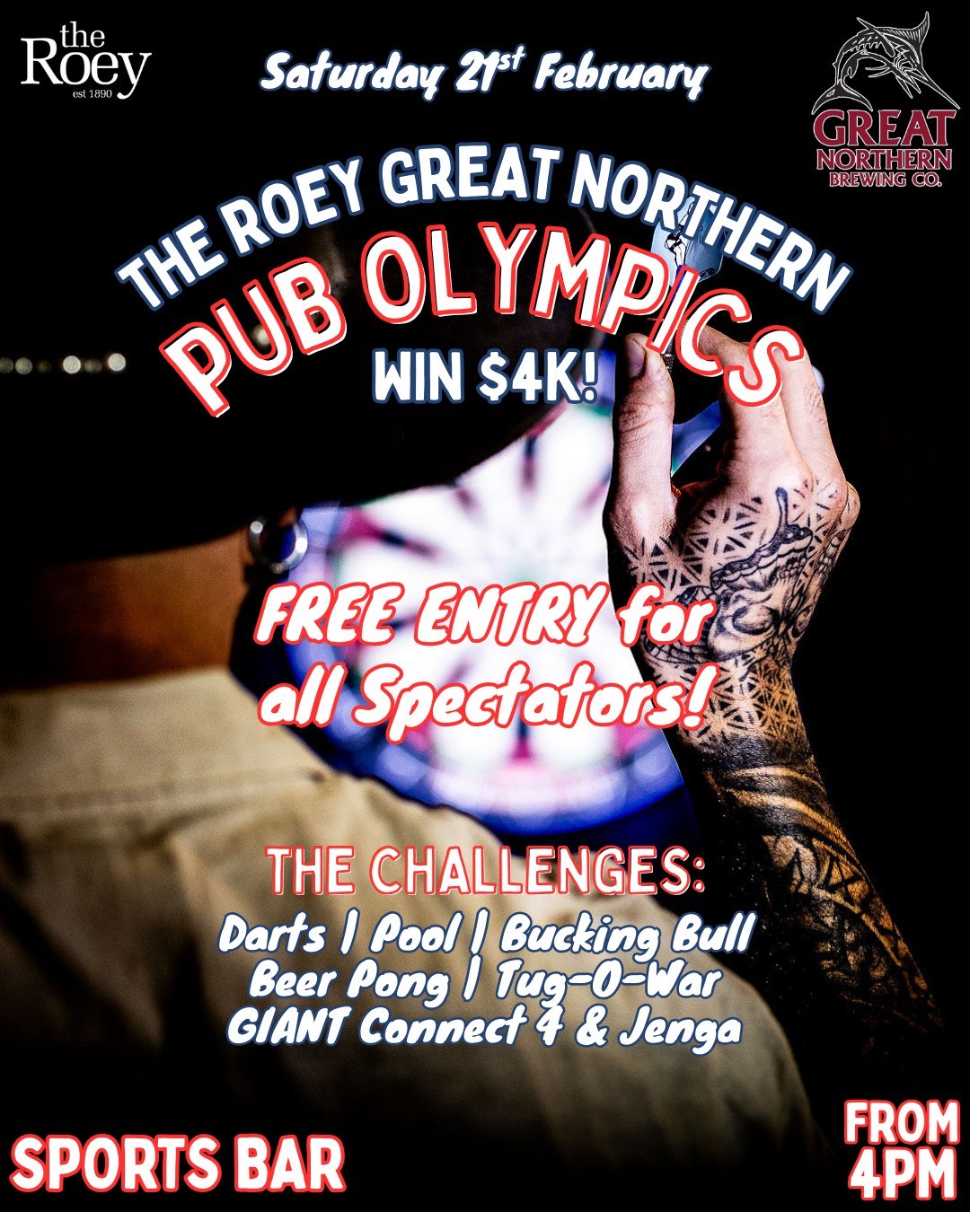 THE ROEY GREAT NORTHERN PUB OLYMPICS 2026... LET THE GAMES BEGIN 🍻🔥 Saturday 21st Feb | 4PM–8PM. Broome’s newest annual rowdiest, proudest & most overly competitive day of glory is kicking off in February. Get your dream team of four together and lock in your spot for the PUB OLYMPICS: a chaotic mix of skill, strength, questionable balance and pure pub-born determination.Your team will go head-to-head across a lineup of absolute bangers: 🎯 Darts 🎱 Pool 🐂 Bucking Bull 🏓 Beer Pong 💪🏽 Tug-O-War 🟡 HUMAN-SIZE Connect 4 + Jenga …and YES, it will get competitive…. And NO, we won’t be responsible for friendship breakups 😂 Champion team wins $4K CA$H! FREE ENTRY FOR SPECTATORS.
