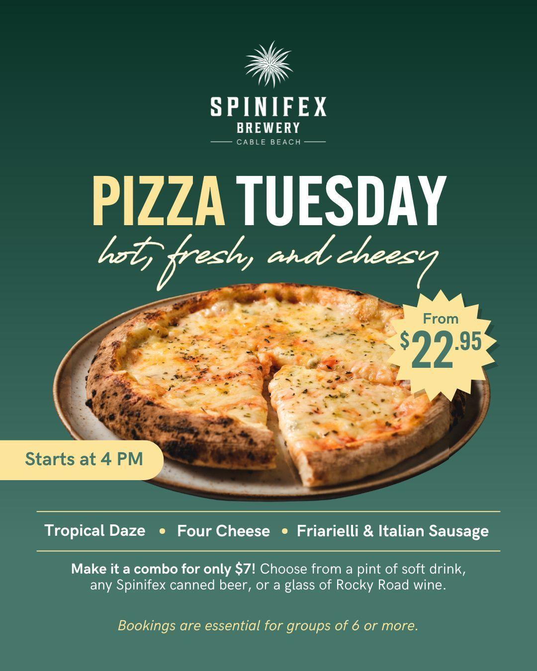 Every Tuesday from 4PM, you can choose from three delicious pizza specials, changing weekly, all for just $22.95 each at Spinifex Brewery Cable Beach. BOOKINGS ARE ESSENTIAL FOR GROUPS OF 6 OR MORE. Simply visit our website or give us a call at (08) 6385 6808. (Note: Specials vary weekly).