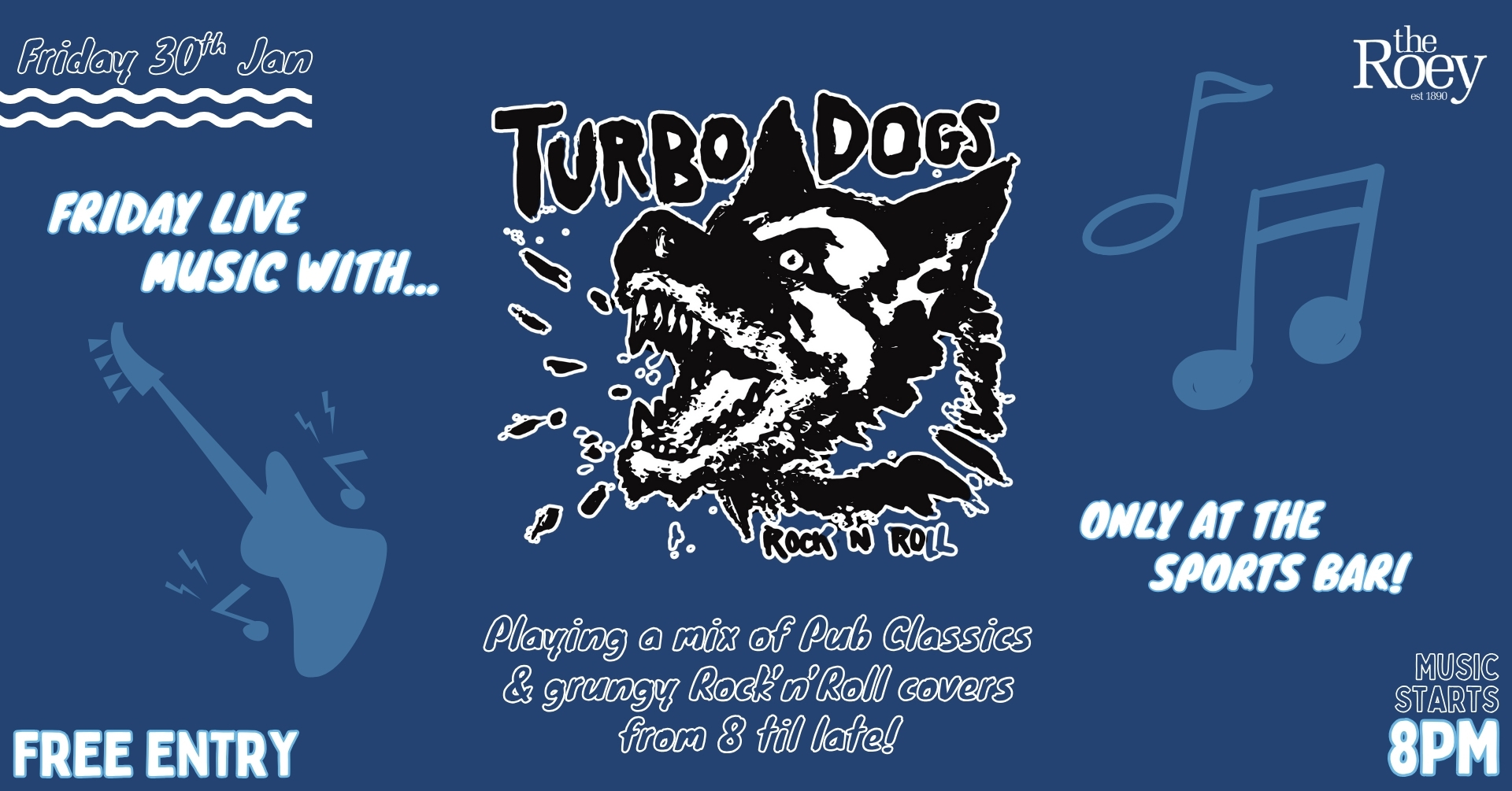 Friday LIVE Music is back for another evening of live local music goodness. On the last Friday of January we've got TURBO DOGS rocking out with all your fave pub classics & rock'n'roll covers from 8pm till late! Stop by early for our MEAT TRAY DRAW at 7pm, with drink specials & FREE ENTRY ALLLLLLLLL NIGHT!
