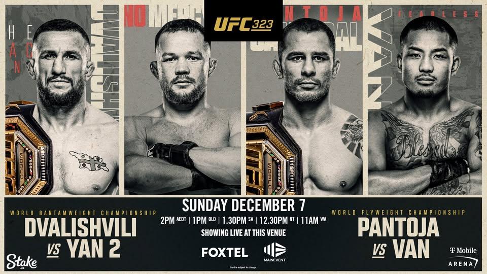 Alright UFC fans, your fifth throw down of the year is scheduled for Sunday 7th December. UFC 323 - Merab Dvalishvili v Petr Yan. Bantamweight Title PLUS... Pantoja vs Van. Live & Loud in the Sports Bar from 10ar. Bar open from 10am. Full menu available from 11am. We'll see you at the bar!