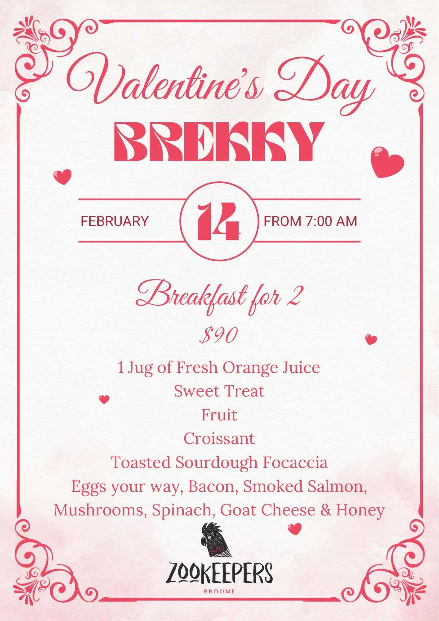 Ready for Valentine’s Day this coming Saturday? Come in for a Brekky to share for two. $90. No bookings required. Just an option for two lovebirds for the occasion. From 7am at Zookeepers Broome.