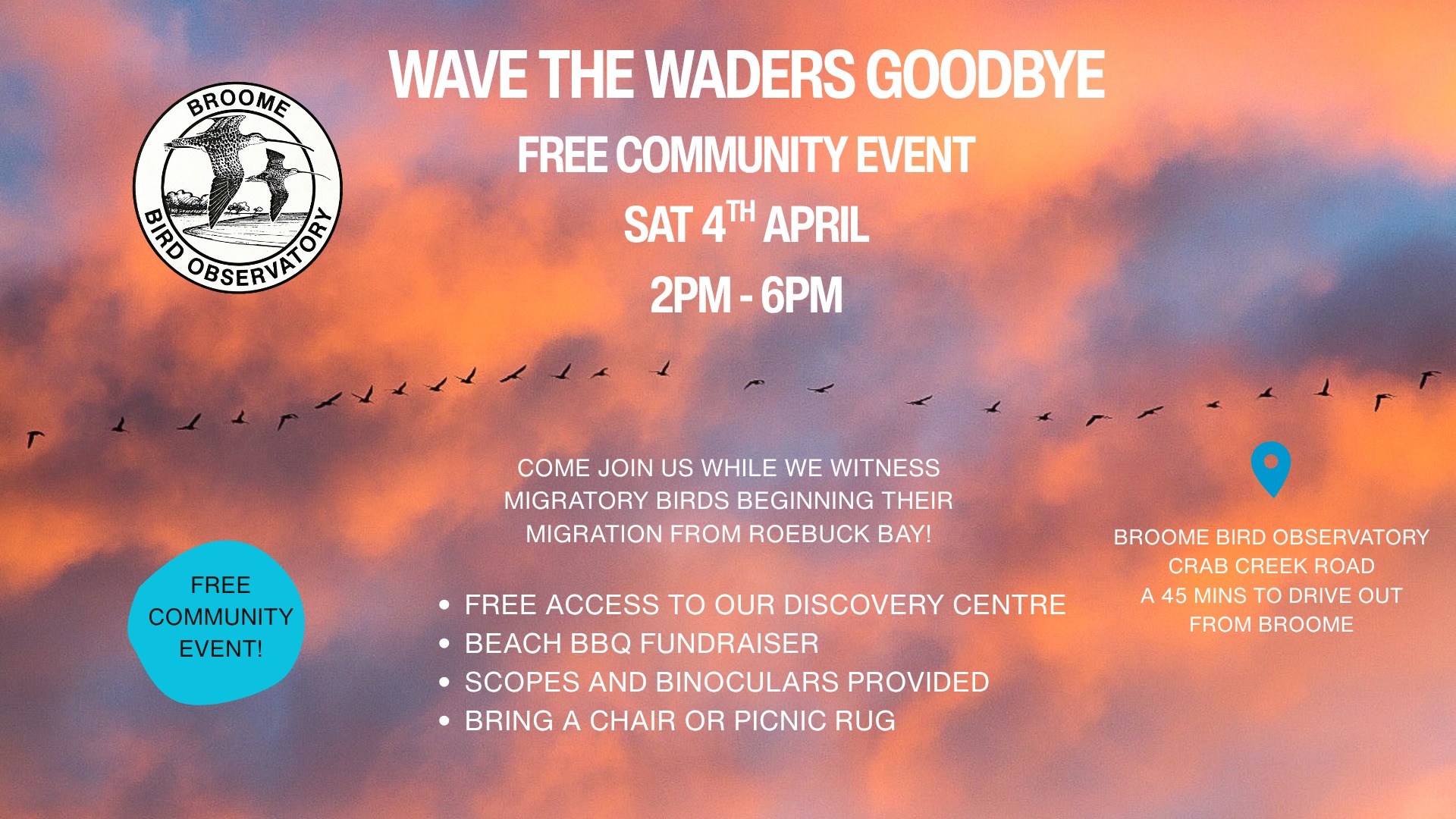 Come Wave the Waders Goodbye! Free Community Event! We have inside information that Crab Creek Road will (fingers crossed) be open in time for the event! Did you know that Broome’s incredible migratory shorebirds travel all the way to Russia in just 10 days—without stopping? Join us at Broome Bird Observatory on April 4th to witness this awe-inspiring natural phenomenon as thousands of shorebirds take flight from Roebuck Bay—Australia’s Shorebird Capital!