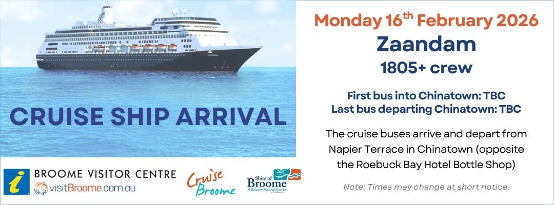 Cruise guests wishing to be collected from the port/wharf should book for the tour named Broome Port Shore Excursion (for Cruise Ships Visiting Broome)