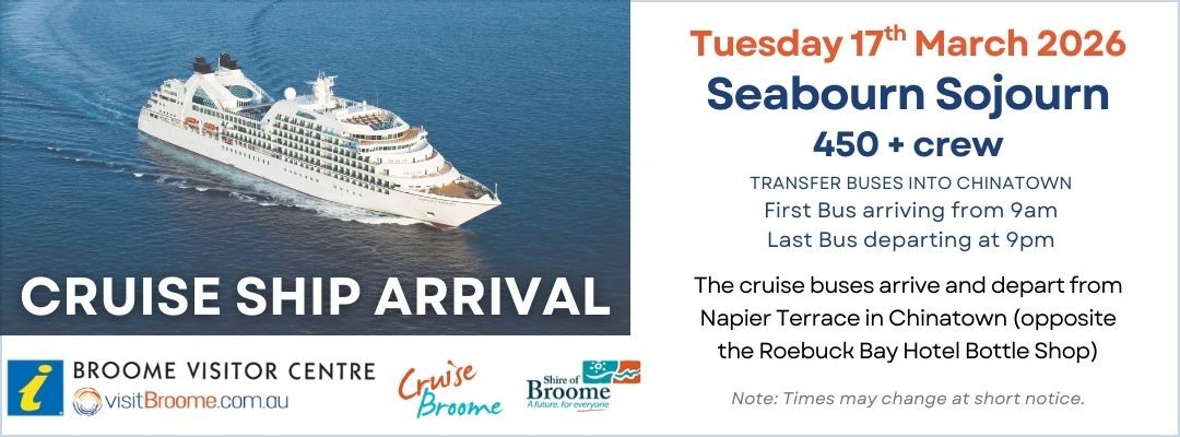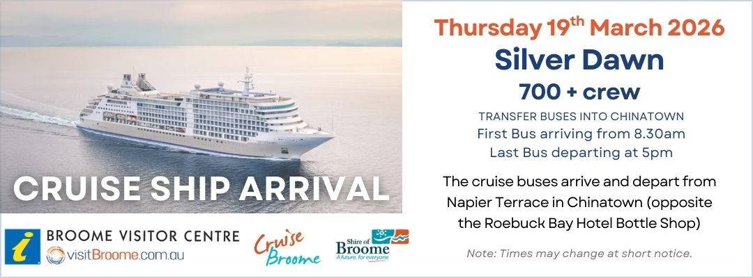 The Broome Visitor Centre is a short walk from the cruise bus drop off location. The Broome Visitor Centre has been providing booking services and information about local tours for over 49 years, so come in and talk to us about the tour options or give us a call on 08 9195 2200.