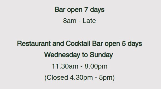 - Restaurant Open: Wed — Sunday 11.30am – 8pm